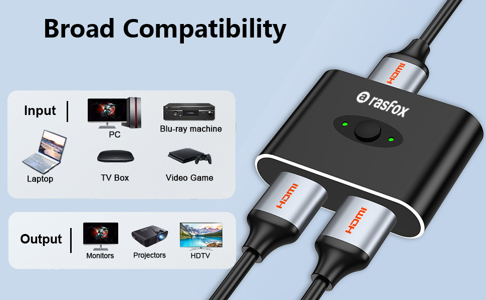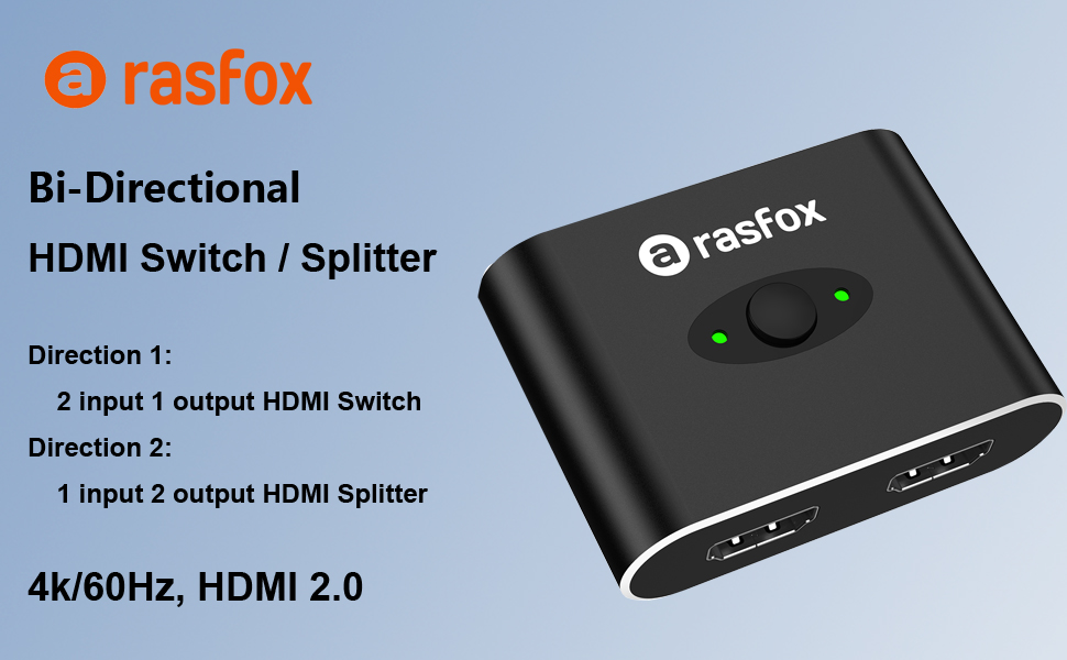 - Rasfox HDMI switch is a high-end active switch (not a ‘passive’ product), it requires extra power to operated by USB cable.